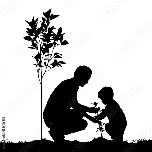 Cane Dad Planting Tree With Child Minimal Eco Fathers Day Vector