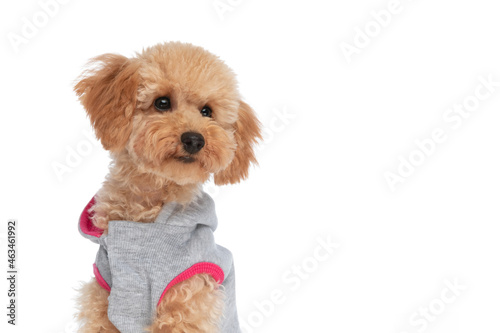 away, hoodie, blouse, clothes, shirt, sitting, seated, dog, puppy, animal, pet, poodle, breed, purebred, pedigree, pedigreed, cute, adorable, little, small, sweet, beautiful, toy, looking, wearing, happy, isolated, white, studio, background