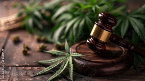 Cannabis leaf and wooden judge's gavel on the table, Concept of law for marijuana or Cannabis