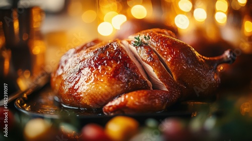 Cantonese-style roast duck hanging in a shop window, golden-brown skin glistening under warm lighting.