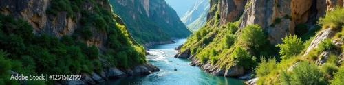 Canyon walls rise high above the winding watercourse, landscape, rock, green