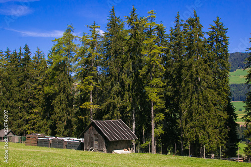 hut, wood, forest, tree, plant, dolomite, farm, rural, high, adige, italy, europa, card, summer, heaven, countryside, view, mountain, typical, alpes, alpine, grass, grass, green