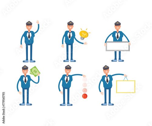 action, activity, avatar, ball, bank, business, cap, captain, cartoon, character, cute, human, idea, illustration, light bulb, male, man, money, necktie, people, person, police, pose, set, show, staff, standing, suit, thinks, vector