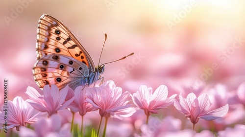 Captivating Butterfly Resting on Pink Flowers in Soft Focus, Highlighting Nature's Aesthetic Beauty and Delicate Details, Ideal for Nature and Wildlife Themes