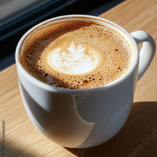Captivating cappuccino foam art close-up cozy setting beverage photography soft natural light detailed texture design inviting atmosphere for coffee lovers