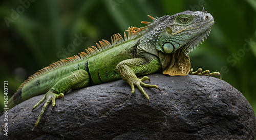 Captivating close-up of a green iguana basking peacefully on a dark rock