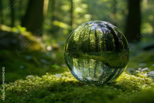 Captivating crystal ball reflects lush green forest scene on mossy ground, magical nature view
