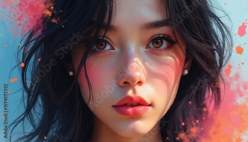 Captivating digital portrait features young woman, vibrant colors, expressive eyes, soft brushwork. Serene face, artistic makeup, detailed facial features create imaginative character representation.