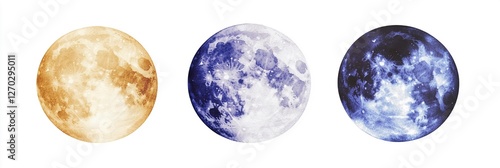 Captivating Hand-Painted Watercolor Artwork of Three Moons: A Morning Lavender, Afternoon Golden, and Midnight Cosmic Blue for Artistic Use - High-Resolution Isolated on White Background