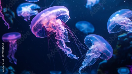 Captivating image of glowing jellyfish flowing gracefully in deep blue aquarium waters