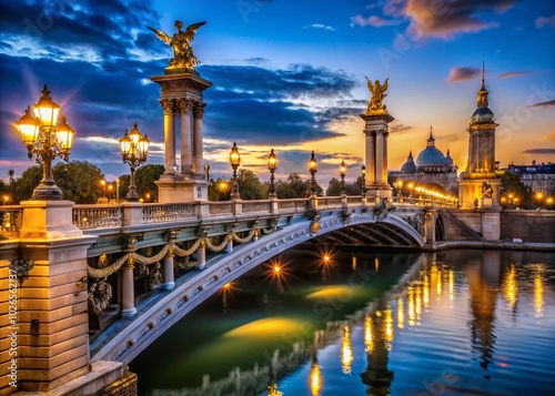 Captivating nighttime photography showcasing the Alexandre III Bridge in Paris, illuminating the stunning architecture and reflections in serene