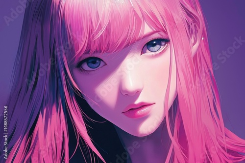 young, portrait, fashion, beautiful, woman, pink, girl, anime, manga, style, hair, female, person, pretty, seducing, love, sexy, cute, happy, teenage, coiffure, colourful, colours, japanese style, make-up, dyed, cosmetic, studio, bright, model, youth, beauty, background, face, caucasian, flower, shiny, smile, illustration, cartoon, comic