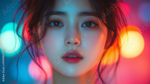 Captivating portrait of a Korean woman with soft features under colorful lights in a night setting