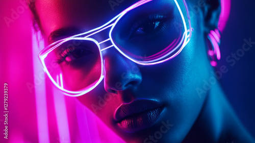 Captivating portrait of a person with glowing glasses in a vibrant neon setting