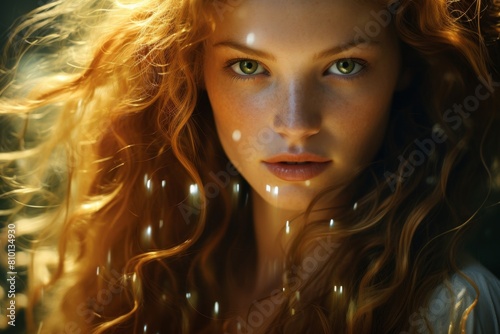 portrait, woman, red hair, green eye, beauty, fashion, glamour, model, closeup, face, skin, make-up, lighting, dramatic, intense, mysterious, alluring, elegant, natural, emotional, expressive, artistic, editorial, high-quality, female, ginger, vibrant, captivating, striking, poise