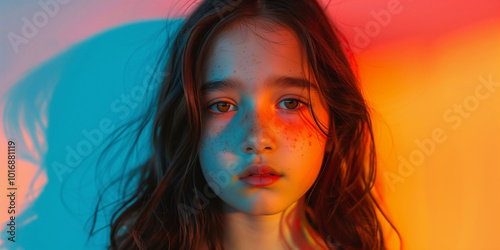 Captivating Portrait of a Young Girl with Freckles and Vibrant Color Lighting