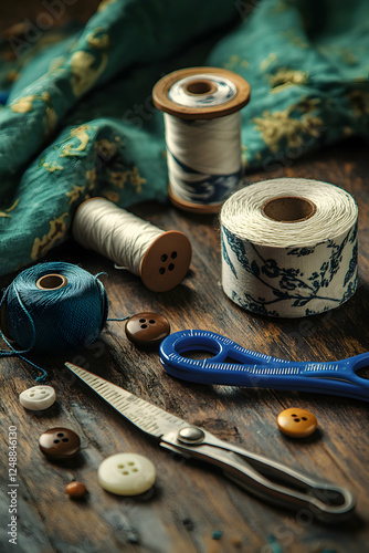Captivating textiles, A vibrant tapestry of sewing essentials arranged thoughtfully on rustic wood, inviting creativity and craftsmanship, and inspiring artistry