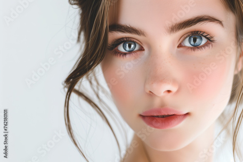 people, beauty, woman, portrait, closeup, face, eye, skin, young, female, blue, gaze, gentle, soft, white, isolated, light, natural, serene, photo, digital artwork, one person, 20s, head shot, model, care, fresh, health, clear, calm, tranquil, pure, flawless, closeup, beautiful, hair