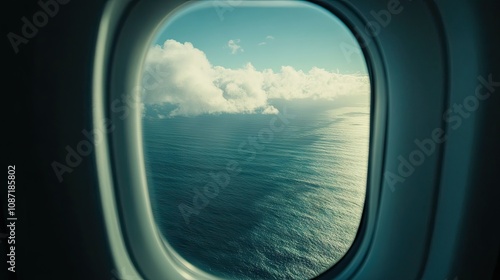 Captivating view from inside an airplane overlooking the vast and mesmerizing ocean, capturing the oceans beauty and intensity with ample photo space for design.