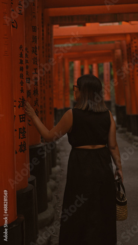 Captivating view of a beautiful hispanic woman in glasses, lost in the mesmerizing walk through the vibrant orange torii gates at fushimi, embodying the essence of traditional japanese culture.