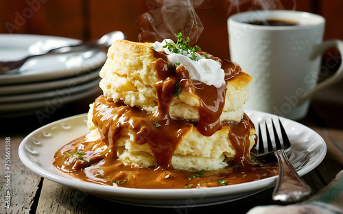 Capture the essence of Biscuits and Gravy in a mouthwatering food photography shot