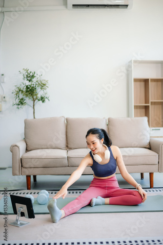 Capture the essence of wellness as a young woman practices yoga and stretches on a mat surrounded