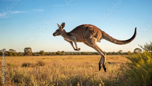 Captured mid-air, a red kangaroo bounces effortlessly across the sunlit grasslands of Australia."