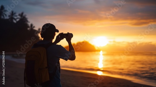 sunset, photo, beach, silhouette, solitude, travel, landscape, nature, serene, water, peaceful, evening, exploration, adventure, backpack, sky, cloud, relaxation, coastline, scenic, calmness, panorama, holiday, escape, beauty, calm, journey, memory, photographer, view, summer, solitary, explorer, environment, orange, blue, light, atmosphere, optical, shoreline