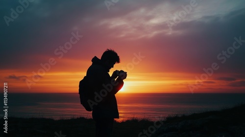 Capturing sunrise with a camera, a silhouette of a photographer adjusting settings with a breathtaking sunrise in the background
