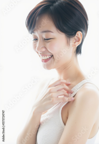 woman, asian, young adult, smile, happy, laughing, beauty, skin, radiant, fresh, joy, indoor, natural light, portrait, face, cheek, pure, clean, youthful, cheerful, gentle, simple, bright, well-being, closeup, genuine, authentic, contented, glowing, healthy, beauty care, relaxation, short hair, white top, serene, natural look, smooth, delicate