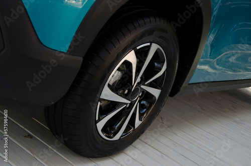 car cover, rubber and new car tire. blue brand car