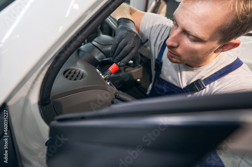 detailing, caucasian, car, man, chemical, men at work, automobile, service, cleaning, dashboard, interior, brush, foam, wheel, panel, head, closeup, washing, dust, hand, auto, disinfection, dirty, vehicle, manual, care, clear, dirt, wipe, transport, shine, cleaner, inside, maintenance, transportation, garage, air, clothes, automotive