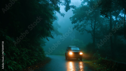 Car drives through foggy forest road at dusk on a rainy evening