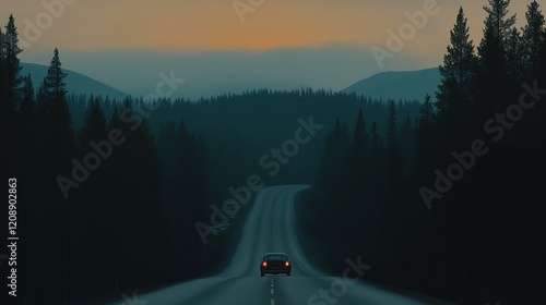 car, driving, road, forest, dusk, evening, sunset, tree, nature, landscape, travel, journey, alone, mysterious, dark, silhouette, vehicle, automobile, light, illuminated, scenic, rural, countryside