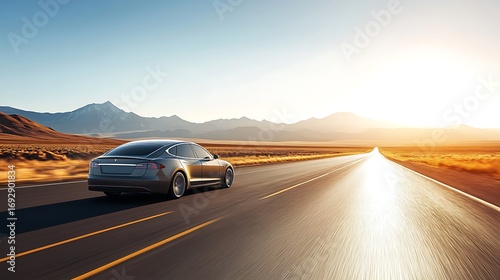 car, nature, road, driving, highway, transportation, mountain, travel, journey, adventure, asphalt, outdoors, road trip, summer, horizontal, majestic, speed, color image, photo, bright, motion, trip, vacation, view, awe, exploration, empty, light, technology, vehicle, blue, scenic, sky, sunset, travel destination, background, landscape, escape, straight, distant
