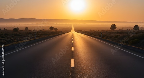 Car driving on endless road disappearing into horizon, travel and freedom concept.