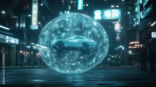Car in a Holographic Sphere: A futuristic concept of a car encased in a holographic sphere, surrounded by the vibrant glow of a city at night.