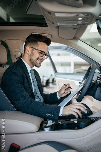 Car seller working in showroom and quality control checking of car details for the last time before buyer comes.