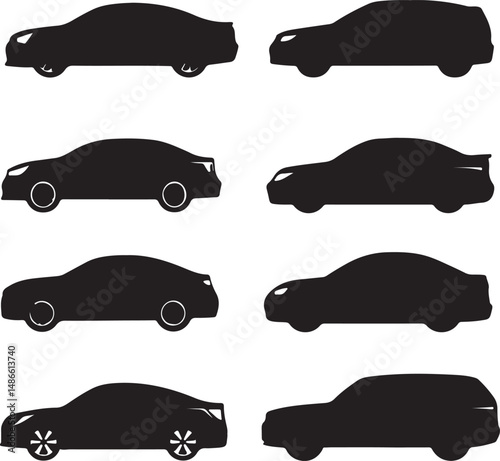 automobile, vehicle, car, silhouette, black, transportation, design, shape, style, modern, graphic, illustration, icon, symbol, outline, profile, side, view, image, art, drawing, pattern, set, collection, choice, variety, different, selection, option, contrast, dark, shadow, minimalist, simple
