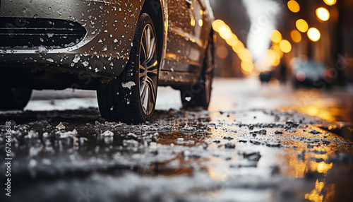 car, transportation, traffic, speed, land vehicle, rain, wet, asphalt, night, headlamp, dripped, driving, city life, motion, dirty, travel, dark, crash, slippery, wheel, raindrop, water, city street, splashing, industry, nature, dusk, selective focus, defocused, damaged, bumper, danger, shiny, weather, winter, snow, illuminated, old, city landscape, metal, bad luck