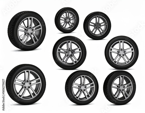 car, wheel, collection, isolated, on, a, white, background, three-dimensional, rendering