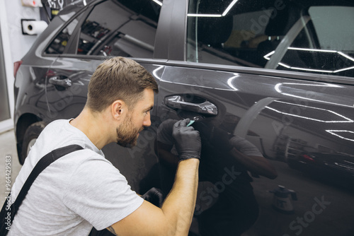 Car wrapping specialist putting vinyl foil or film on car.