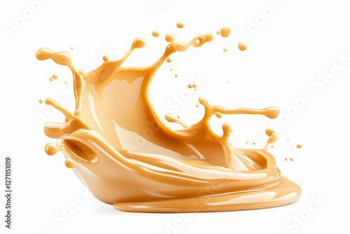 Caramel liquid splash, creating abstract form on white. Food, cooking concept