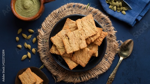Cardamom-flavored rusk displayed on a dark blue backdrop with jute and cloth, showcasing golden-brown texture and delightful crunchiness.