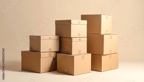 Cardboard boxes stacked for storage, moving, packaging, shipping, or organization against a plain beige background, suitable for logistics or delivery concepts.