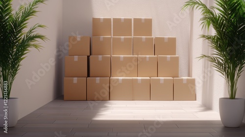 cardboard, box, stacked, sunlit, plant, cardboard box, shipping, storage, arrangement, organised, delivery, brown, cardbox, interior, minimal, bright, indoor, natural, decor, shipment, pile, symmetry, light, pattern, background, wall, flooring, design, simplicity, clean, neat, warehouse, parcel, container, empty, sunny, home, lifestyle, peaceful, order, organisation, houseplant, calmness, neatness, modern, space, minimalistic, green, aesthetic