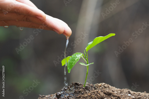 Care and watering the tree by hand, The hands are dripping water to the small seedlings, plant a tree, reduce global warming, World Environment Day