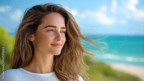 woman, beach, windy, happy, relaxation, nature, ocean, summer, young, female, smile, beautiful, hair, outdoors, lifestyle, leisure, freedom, carefree, enjoyment, serenity, calmness, paradise, sunny, wave, coast, sand, scenic, environment, tropical, vacation, travel, adventure, recreation, wellness, rejuvenation, calmness, breeze, refreshing, radiance, positivity, joy, relaxed, serene, peaceful, blissful, content, graceful, idylli, picturesque