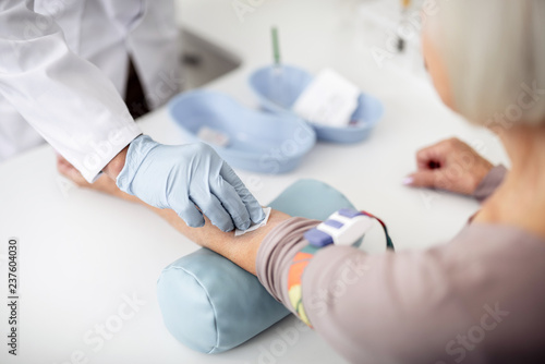 Careful doctor in rubber gloves cleaning the arm of his patient before the injection while standing in front of the table