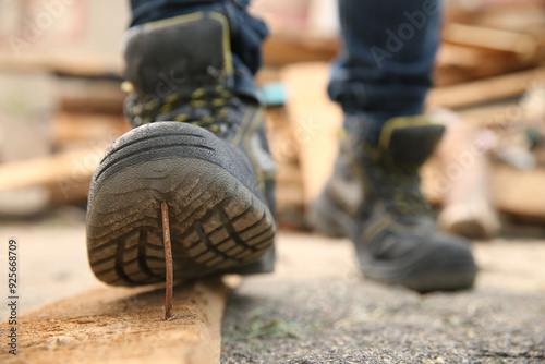 Careless worker stepping on nail in wooden plank outdoors, closeup